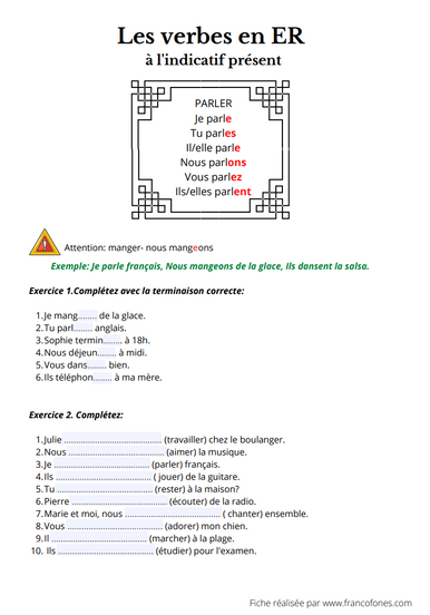 Francofon.ES vous présente une fiche pédagogique qui explique la conjugaison des verbes ER à l'indicatif présent avec les exercices, le corrigé et une activité de DOMINO.